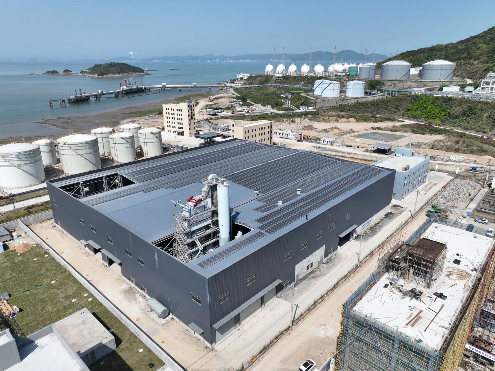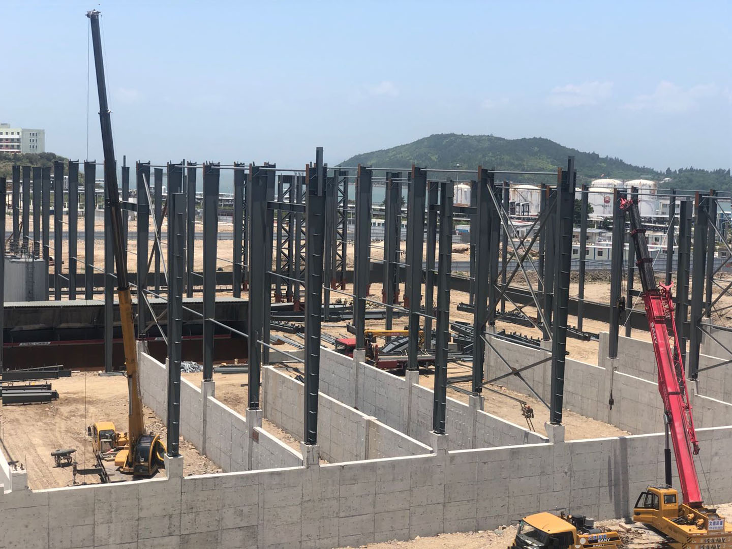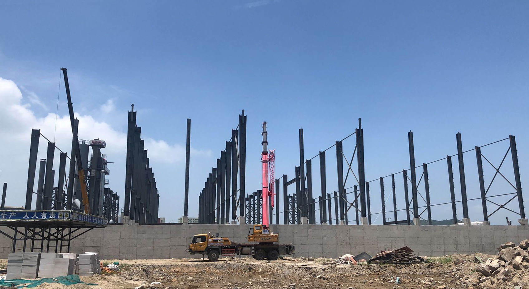本次施工的浙江開程新材料有限公司年產(chǎn)100萬噸封閉式環(huán)保型瀝青混凝土攪拌站鋼結(jié)構(gòu)工程位于溫州市洞頭區(qū)小門島東嶼村B-02AD塊。鋼結(jié)構(gòu)平面尺寸為97m×87.6m,面積約8500㎡,為單層三連跨結(jié)構(gòu),跨度分別為A-C軸21.0m、C-F 軸41.8mF-H軸23.18m。該車間的鋼柱采用焊接H型鋼截面,鋼梁采用焊接變截面H型鋼截面,鋼柱柱頂標(biāo)高為16m,女兒墻頂標(biāo)高為17.5m。梁、柱等主要構(gòu)件(含附屬構(gòu)件)采用Q355B鋼,其余次要構(gòu)件(含附屬構(gòu)件)采用Q235B鋼。